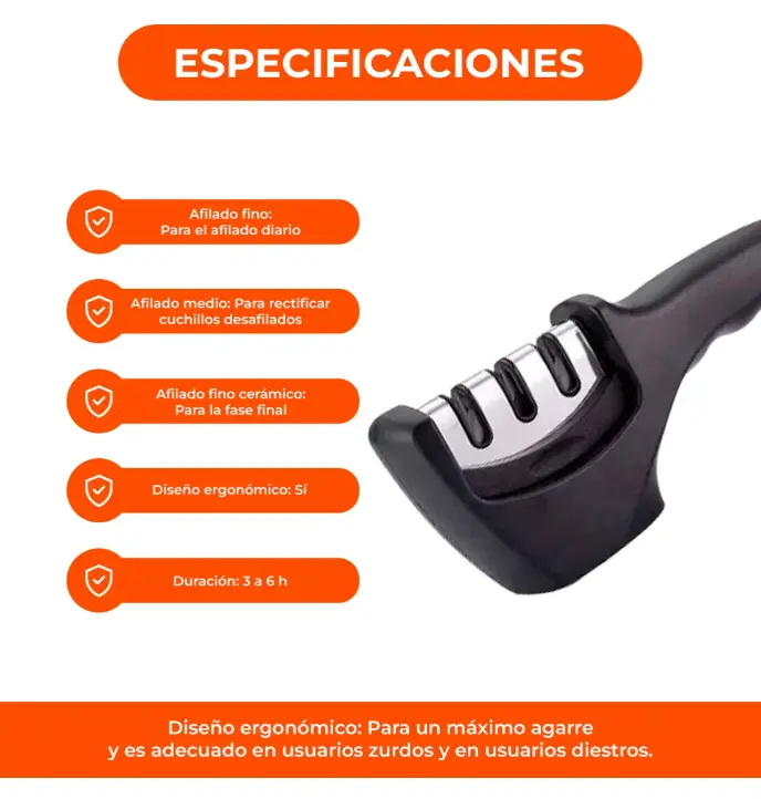 Mantén tus cuchillos siempre listos en tres simples etapas: preparación, afilado fino y pulido final. Su diseño compacto y ligero con base antideslizante y mango ergonómico garantiza un uso seguro y cómodo.